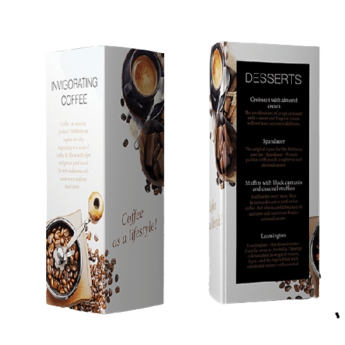 Menu Display Mini Triangle biasanya digunakan untuk menu, sehingga penggunaannya hanya perlu diputar dan dalam satu meja bisa meilhat menunya secara bersamaan